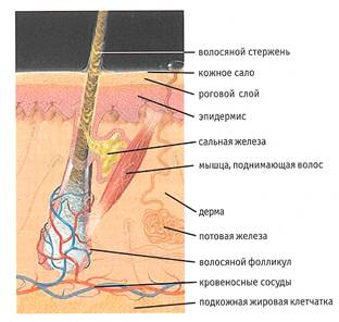 Наружная часть волоса, находящаяся над поверхностью кожи, подобно роговому слою кожи не содержит живых клеток. Поэтому ее бесполезно «питать», «стимулировать» и т.д. Однако волос имеет и живую часть — луковицу, или волосяной фолликул, в котором живут клетки, производящие волос. Каждый фолликул «подключен» к клубку кровеносных капилляров, из которых фолликулярные клетки получают питание. Кроме того, каждый волос связан с сальной железой, и ее проток открывается у основания волоса. Из анатомии волоса очевидно, что все воздействия, которые повреждают кутикулу, будут неминуемо ослаблять волос и увеличивать риск обламывания стержня. Напротив, все, что защищает кутикулу или хотя бы временно устраняет ее повреждения, будет уменьшать повреждение волоса и улучшать его внешний вид. На состояние волоса будут влиять также вещества, способные проникнуть в волосяной фолликул. Особенностью волос является периодический рост. Каждый волос проходит три стадии — анаген, катаген и телоген. В анагене волос растет; эта стадия продолжается несколько лет. Затем наступает остановка роста — катаген. И наконец, начинается процесс атрофии и выпадения старого волоса, на месте которого начинает расти новый. Ногти, так же как и волосы, состоят из наружной и внутренней части. Наружная часть, или ногтевая пластина, построена из плотно упакованных роговых (кератиновых) чешуек, а внутренняя часть — ногтевое ложе — клетки эпидермиса, покрытые матриксом ногтя. В отличие от волоса, ноготь растет непрерывно со скоростью примерно 0,12 мм в день.