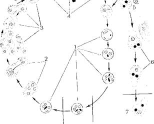 Рис. 181. Жизненный цикл гоксоплазмы. 1 кошка -- основной хозяин,» котором происходит шизогония и подовой цикл; 2, 4 -- стадии развития оописты (по 2 споры в каждой, по 4 спорозоита и споре); 5-6 мышь - промежуточный хозяин, в котором происходит бесполое размножение и образование цист; 7 внутриутробное заражение мышей. превращаются в шизонты, которые начинают размножаться путем множественного деления, или шизогонии. В результате образуется группа мелких веретеновидных мерозоитов, располагающихся относительно друг друга как дольки мандарина (рис. 181). Через некоторое время мерозоиты выходят в просвет кишечника, внедряются в новые клетки и вновь превращаются в шизонтов. Через несколько шизогоний бесполое размножение сменяется половым процессом. Мерозоиты, проникнув в клетки, превращаются в незрелые половые формы — микрогаметоциты (мужские) и макрогаметоциты (женские). Из микро- гаметоцитов образуются нитевидные сперматозоиды с двумя жгутиками. Макрогаметоциты растут, превращаются в макрогаметы и сливаются с микрогаметами. Зигота образует прочную двухслойную оболочку и превращается в ооцисту. Внутри ооцист происходит спорогония и образуются две споры с четырьмя спорозоитами в каждой. Ооцисты являются инвазионной стадией как для промежуточного, так и для окончательного хозяина. Ооцисты могут выделяться с испражнениями, мочой, через носовую слизь, слюну, и т д. У млекопитающих возможно внутриутробное заражение через плаценту.Токсоплазм отличает чрезвычайно широкий круг животных, служащих промежуточными хозяевами. Многие из них являются пищей для окончательного хозяина (грызуны, птицы), их ткани и органы пр!- поедании служат источником заражения окончательного хозяина. Такая связь обеспечивает широкое распространение токсоплазм в природе, что способствует, сохранению вида. Человек заражается, очевидно, от домашних животных, прежде всего от кошек. Патогенное действие. Клинические симптомы очень разнообразны, что объясняется различной локализацией паразита. Поражаются нервная, половая, лимфатическая системы, органы ¡рения. Нередко наблюдается бессимптомное носительство. Имеются данные о том, что среди населения встречается до 30% здоровых пара- зитоносителей. Профилактика. Профилактические мероприятия общественного характера только разрабатываются. Личная профилактика в основном сводится к личной гигиене при общении с домашними животными. 16.4. КЛАСС ИНФУЗОРИИ (INFUSORIA) Морфо физиологическая характеристика. Наиболее сложноорганизованные простейшие. Форма тела разнообразна, чаще продольно-овальная. Размеры варьируют от 30—40 до 1000—2000 мкм. Органоиды передвижения — реснички. У некоторых имеются защитные приспособления — трихоцисты, короткие палочки, расположенные под пелликулой. При раздражении трихоцисты выстреливают, превращаясь в длинную упругую нить, поражающую врага или добычу. Ротовое отверстие часто окружено нредротовой впадиной (перистом). Рот ведет в клеточную глотку (цитофаринкс), откуда пища попадает в эндоплазму и пищеварительную вакуоль. Непереваренные остатки удаляются через специальное отверстие — порошицу, расположенную у заднего конца тела. Строение сократительной вакуоли усложнено — вокруг собственно вакуоли (центральный резервуар) расположены венчиком 5—7 приводящих канальцев. Удаляемые вещества 