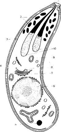 Рис. 180. Ультраструктура мерозоита (сПорозоита) токсоплазмы. I коноид, 2 - микронемы; 3 - микротрубочки; 4 микропора; 5 жировая капля; б — ядро; 7 - эндоплазматическая сеть; 8 — пластинчатый комплекс; 9 митохондрии; 10 — роптрии. При попадании цист в окончательного хозяина спорозоиты, проникнув в клетки кишечника, приобретают округлую форму и