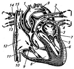 1. В тетрадях для лабораторных работ зарисуйте схему кругов кровообращения. 2. Рассмотрите рисунок тока крови в сердце (рис. 15), сделайте обозначения. Рисунок 15. Ток крови в сердце.