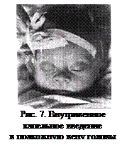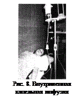 у старших детей инъекции чаще всего делаются в области локтевого (рис. 8), реже – лучезапястного и голеностопного суставов. Особенности методики внутривенной струйной инфузии: – иглы – длинные, большого диаметра, с коротким срезом на конце, шприцы – большого диаметра; – кожа обрабатывается спиртом или эфиром; – вначале кожу выше места инъекции необходимо прижать пальцем или всей рукой (это обычно делает медсестра-помощница) либо плотно наложить жгут; – игла устанавливается под углом к коже по току венозной крови и вводится вглубь до прокалывания одной стенки вены; признаком попадания в вену является появление крови в канюле иглы; – некоторые медсестры делают инъекцию сразу иглой со шприцем; в таком случае расположение в вене определяется потягиванием поршня. Опытная медсестра обычно попадает в вену с первого раза; в противном случае необходимо, не выводя иглу из кожи, немного оттянуть ее назад и повторно постараться войти в ту или иную вену; в крайнем случае, игла забирается, место плотно прижимается смоченным спиртом ватным тампоном, затем подбирается другое место для в/в введения; – обычно струйно вводится несколько лекарственных средств из нескольких шприцев, которые поочередно вставляются во введенную в вену иглу; так как лекарства действуют практически мгновенно, вводятся они медленно; – на протяжении одной в/в инъекции можно ввести не более 50 мл: – после аккуратного выведения иглы кожа в месте инъекции обрабатывается спиртом, затем для предотвращения кровотечения накладывается стерильная давящая повязка. С целью введения большего объема лекарственных средств применяется внутривенная капельная инфузия, когда жидкость поступает в вену не струей, а течение ее регулируется видимыми каплями. Вначале готовится так называемая система (рис. 9), в состав которой входят: