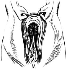 Акушерське сприяння в II періоді пологів включає в себе ряд послідовних міроприємств і маніпуляцій, які проводить акушер в кінці II періоду пологів, якими він наслідує фізіологічність пологів і запобігає травматизму матері. Одним з прийомів акушерського сприяння є захист промежини. Суть цього прийому полягає в тому, щоб запобігати занадто стрімкому переміщенню голівки по родовим шляхам і по можливості, щоб голівка прорізувалась своїм найменьшим розміром (тобто при максимальному згинанні - малий косий розмір). Захист промежини заключасться в зменшенні сили, з якою голівка плоду давить на промежину і в регуляції правильного проходу голівки через статеву щілину. Захист промежини починається з моменту прорізування голівки. Для того, щоб запобігти передчасному розгинанню голівки, акушер стає справа від породіллі і кладе долоню лівої руки на лонне зчленення так, щоб долонні поверхні щільно зімкнених між собою чотирьох пальців розміщувались плашмя на голівці, і, по можливості, покривали всю голівку. Таким чином ми запобігаємо передчасному розгинанню голівки та надмірно швидкому її проходженню по родовим шляхам. При цьому натискувати треба всією долонною поверхнею пальців, тоді як натискування тільки кінчиками пальців може призвести до травмування голівки. Другий момент - виведення голівки із статевої щілини поза потугами. Суть цього моменту - у найбільш обережному виведенні голівки із статевої щілини. Здійснюється це за допомогою розтягування великим і вказіним пальцем бульбарного кільця над голівкою, як тільки закінчилася потуга. Третій момент - зменшення напруги промежини. Мета - зробити промежину більш податливою до голівки за рахунок тканин, “позичених” із сусідніх ділянок, тобто зсув бокових тканин по можливості назад, в бік промежини. Четвертий момент - регулювання потуг під час вставляння голівки тім’яними буграми. В цей час небезпека розриву промежини і надмірного здавлення досягає свого максимума. Перед акушером в цей момент стоїть завдання вміло регулювати потуги. Коли голівка зупинилась тім’яними буграми в статевій щілині, а підпотилична ямка - під лонним зчлененням, породіллі пропонують глибоко і часто дихати відкритим ротом. Тоді обома руками затримують просування голівки, поки потуга значно не послабшає. Права рука акушера здавлює поза потугою промежину над лицем плоду так, що вона зісковзує з лиця, ліва рука в цей час повільно припіднімає голівку плоду вверх і розгинає її. П’ятий момент - звільнення плечового поясу і народження тулуба плоду. Після народження голівки породіллі пропонують тужитися. Голівку захватують обома руками так, щоб долоні обох рук плашмя прилягали до правої та лівої скронево-щічної ділянок плоду. При цьому голівку плоду підтягують вниз до тих пір, пори плечико не підійде під лонне зчленення. Потім лівою рукою захватують голівку (долоня знаходиться на нижній щоці плоду), припіднімаючи цією рукою голівку вверх, а правою ісуваючи промежину з заднього плечика. Останнє обережно виводять, щоб не порушити цілісність ключиць і промежини породіллі. Коли плечовий пояс звільнений, в підпахвові області плоду вводять спинки вказівних пальців рук і тулуб припіднімають вверх. Це сприяє швидкому і бережному його народженню. В тих випадках, коли розрив промежини здається неминучим, проводят