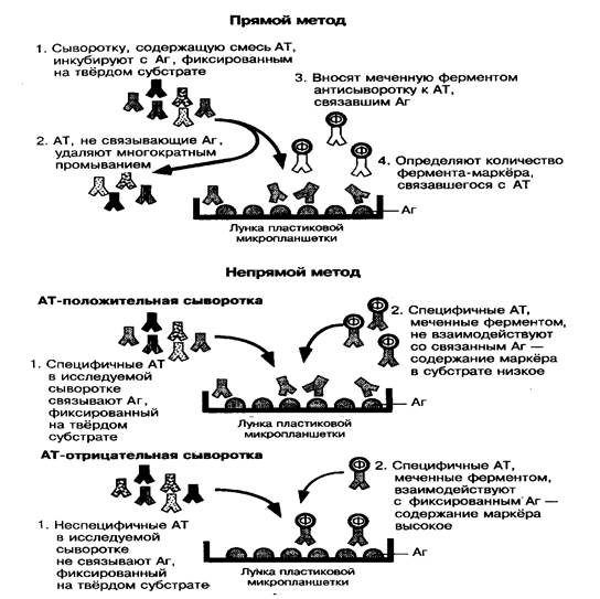 Наиболее распространен твердофазный ИФА, при котором один из компонентов иммунной реакции (антиген или антитело) сорбирован на твердом носителе. В качестве твердого носителя используются микропанели из полистирола. При определении антител в лунки с сорбированным антигеном последовательно добавляют сыворотку крови больных, антиглобулиновую сыворотку, меченную ферментом и смесь растворов субстрата для фермента и хромогена. Каждый раз после добавления очередного компонента из лунок удаляют не связавшиеся реагенты путем тщательного промывания. При положительном результате изменяется цвет раствора хромогена. Твердофазный носитель можно сенсибилизировать не только антигеном, но и антителом. Тогда в лунки с сорбированными антителами вносят искомый антиген, добавляют иммунную сыворотку против антигена, меченную ферментом, а за тем – смесь растворов субстрата для фермента и хромогена. ИФА применяют для диагностики заболеваний, вызванных вирусными и бактериальными возбудителями. Date: 2015-07-02; view: 439; Нарушение авторских прав |