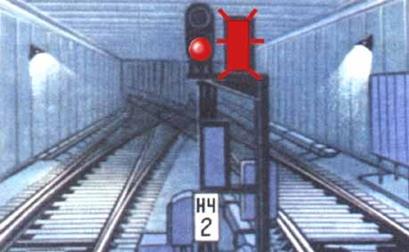 Повторитель красного огня устанавливается на маневровых све- тофорах, ограждающих интенсивно используемые маневровые мар- шруты (оборот составов), у светофорной головки. Повторитель лунно-белого огня маневрового светофора — молоч- но-белый огонь — загорается одновременно с лунно-белым огнем све- тофора и разрешает машинисту передать управление составом. Повторитель лунно-белого огня маневрового светофора, ограждающего выход с пути для оборота составов, размещается у места остановки перво- го вагона состава, поданного на этот путь и подает сигнал в обе стороны. 7.6. Светофоры, используемые для разделения пути на участки для отстоя составов, постоянно подают сигнал один красный огонь (рис. 7.9). Такие светофоры оборудуются пригласительными сигналами.