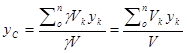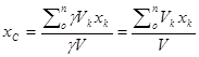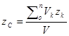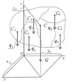 Для определения точки приложения силы тяжести (равнодействующей параллельных сил) используем теорему Вариньона о моменте равнодействующей: Момент равнодействующей относительно оси равен алгебраической сумме моментов сил системы относительно этой оси. Изображаем тело, составленное из некоторых частей, в пространственной системе координат (рис. 8.2). Тело состоит из частей, силы тяжести которых qk приложены в центрах тяжести (ЦТ) этих частей. Пусть равнодействующая (сила тяжести всего тела) приложена в неизвестном пока центре С. xC, yC и zC — координаты центра тяжести С. xk, yk и zk — координаты центров тяжести частей тела. Из теоремы Вариота следует: