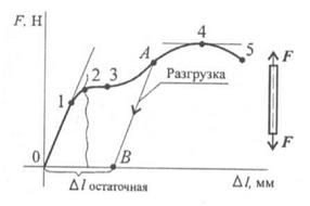 образец вернется к исходным размерам; эта область называется областью упругих деформаций. Упругие деформации полностью исчезают после снятия нагрузки. При продолжении испытаний после точки 2 образец уже не возвращается к исходным размерам, деформации начинают накапливаться. При выключении машины в точке А образец несколько сжимается по линии А В, параллельной линии 01. Деформации после точки 2 называются пластическими, они полностью не исчезают; сохранившиеся деформации называются остаточными. На участке 01 выполняется закон Гука: В пределах упругости деформации прямо пропорциональны нагрузке. Считают, что все материалы подчиняются закону Гука. Поскольку упругие деформации малы по сравнению с геометрическими размерами детали, при расчетах считают, что размеры под нагрузкой не изменяются. Расчеты ведут используя принцип начальных размеров. При работе конструкции деформации должны оставаться упругими. К нарушению прочности следует относить и возникновение пластических деформаций. Хотя в практике бывают случаи, когда местные пластические деформации считаются допустимыми.