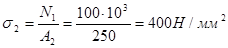 Сечение 1. – N1 + F1 = 0; N1 = F1 = 100 кН. Сечение 2. - 80 - N2 + 100 = 0; N2 = 100 - 80 = 20 кН. В обоих сечениях продольные силы положительны. 2. Определяем нормальные напряжения Сопоставляя участки нагружения с границами изменения площади, видим, что образуется 4 участка напряжений. Нормальные напряжения в сечениях по участкам: