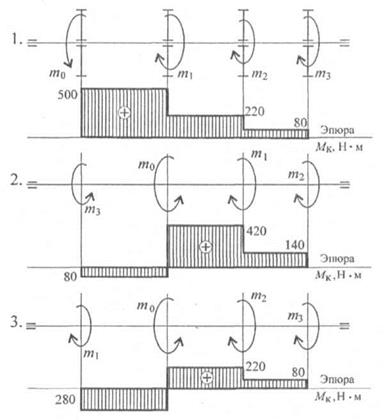 Первый вариант: Второй вариант: Третий вариант: Контрольные вопросы и задания 1. Какие деформации возникают при кручении? 2. Какие гипотезы выполняются при деформации кручения? 3. Изменяются ли длина и диаметр вала после скручивания? 4. Какие внутренние силовые факторы возникают при кручении7 5. Что такое рациональное расположение колес на валу? 6. Для заданного вала (рис. 26.6) выбрать соответствующую эпюру крутящих моментов (а, б, в). m1 = 40 Н·м; m2 = 180 Н·м; m0 = 280 Н·м.