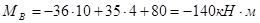 RA · 10 + 80 + 35 · 4 + 70 · 2 = 0$ RA · 10 = - 80 – 140 – 140 = - 360$ RA = - 36 кН.