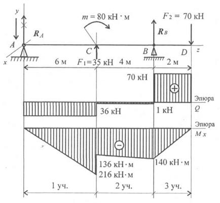 Справа и слева от точки В момент имеет одинаковые значения. Участок 3 (от точки В (справа) до точки D). В точке В приложена внешняя сила RВ. Здесь появляется скачок на величину 71 кН, Qb = -1 + 71 = 70 кН. Дальше по участку поперечная сила не изменяется. Момент в точке D равен нулю, т.к. здесь не приложена внешняя пара сил: MD = 0. Рассмотрение поперечных сил и изгибающих моментов можно было провести и справа налево. По полученным значениям сил и моментов строим эпюры (эпюры под схемой вала, рис. 30.4).