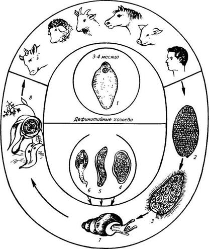 Источники распространения инвазии. Ими являются зараженные животные, выгнанные на пастбище без предварительной дегельминтизации. Определенную роль в распространении возбудителей болезни играют олени, косули, верблюды, зайцы, нутрии, кабаны и др. Известно более 40 видов животных — дефинитивных хозяев фасциол. Значительную роль в распространении фасциолеза играют видовой состав и численность моллюсков — промежуточных хозяев, жизнь которых связана с наличием мелких речушек водоемов и прудов. Источником заражения служат низинные пастбища и водоемы, где сохраняется инвазионное начало — адолескарии. Животные нередко заражаются при скармливании им травы или сена с неблагополучных пастбищ или сенокосов. Рис. 10. Биология развития F. hepatica: 1 — общий вид трематоды, 2 — яйцо, 3 — мирацидий; 4 — спороциста; 5 — редия; 6 — церкарии,7 — моллюск; 8 — адолескарии Температура, влага, растительность и другие факторы внешней среды способствуют распространению промежуточных хозяев, развитию личиночных стадий фасциол, длительности сохранения в Яйца фасциол в высыхающих фекалиях перестают развиваться и погибают на 8—9-е сутки, а сформировавшиеся мирацидии сохраняются не более 1—1,5 сут. Гниение и низкая температура (от —5 до -15 °С) убивают мирацидиев в яйце или зародыша за 2-—3 сут, при температуре 40—50 °С они погибают через несколько минут, 0,5%-ный раствор соляной кислоты убивает зародыш через 1 мин, 2%-ный раствор едкого натра — через 2 мин. Адолескарии устойчивы при — 4...-6 °С и долго не погибают. В Московской и других областях Нечерноземья часть адолескариев может дожить до весны и служить источником заражения животных (хотя это особого значения в эпизоотологии не имеет). Дождливые и теплые весна и лето способствуют резкому увеличению численности моллюсков, их заражению яйцами фасциол и появлению на пастбищах в большом количестве адолескариев. Использование новых земель с применением открытой системы орошения также способствует распространению инвазии, так как моллюски быстро осваивают новые биотопы. Патогенез и иммунитет. Патогенез фасциолеза связан с биологией развития возбудителя в дефинитивных хозяевах. Молодые фасциолы в период миграции травмируют стенку кишечника, сосуды и печень, вызывая значительные кровоизлияния. В результате травм возникает воспалительный процесс в кровеносных сосудах, стенке кишечника, лимфоузлах, брюшине, строме печени и желчных ходах. Фасциолы при передвижении переносят большое количество микроорганизмов в органы и ткани. Взрослые фасциолы, передвигаясь в желчных ходах, травмируют шипами желчные ходы и способствуют выделению продуктов воспаления, слизи, отложению минеральных солей. Скапливаясь в больших количествах, вместе со слизью паразиты закупоривают желчные ходы и вызывают застой желчи. Вследствие этого отдельные участки протоков расширяются и заметно выступают на поверхности печени, развивается цирроз. Во время миграции фасциолы растут и развиваются, выделяя продукты обмена, а некоторая их часть погибает. Таким образом, как экзогенные, так и соматические антигены оказывают аллергическое воздействие на организм хозяина. Иммунитет при фасциолезе почти не изучен. Но из практики известно, что сколько-либо заметный врожденный иммунитет отсутствует. А если постинвазионный иммунитет и есть, то он 