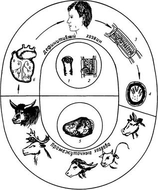 1 — сколекс цепня, 2 — гермафродитный членик, 3 — зрелый членик, 4 — яйцо, 5 — мышцы, пораженные цистицеркусами, б — цистицеркусы в сердечной мускулатуре.