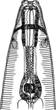 Биология развития. Оксиурис — геогельминт. После оплодотворения в местах локализации самцы погибают, а самки по мере созревания постепенно передвигаются к прямой кишке и частично прикрепляются в перианальных складках длинным хвостовым концом. При доступе кислорода они начинают выделять в прианальную область яйца, которые маточным секретом прикрепляются под корнем хвоста животного. Самки, выпавшие наружу, могут откладывать яйца, если попадут на поверхностные слои фекалий (при доступе кислорода). Через 2—3 сут в яйце развивается инвазионная личинка. Животные заражаются перорально во время приема корма, воды, облизывая стены денника и кормушек, куда часто попадают яйца. В кишечнике лошади из яйца выходит личинка и через 30—45 сут становится половозрелой. Продолжительность жизни гельминтов ограничивается длительностью развития гельминтов в организме хозяина, так как после отложения яиц погибают и самки. Эпизоотологические данные. Оксиуроз — заболевание лошадей, проявляющееся в основном при содержании в конюшнях. Максимум инвазии приходится на вторую половину зимы и раннюю весну. Чаще всего болеют молодняк до 1 года и старые ослабленные животные. Кроме лошадей оксиуроз отмечается у ослов, мулов, лошаков и зебр. Патогенез и иммунитет. Паразитируя в большом количестве в толстом отделе кишечника, оксиурисы травмируют его слизистую, в результате развивается катаральное воспаление. В период откладки яиц самками в области ануса они механически воздействуют на слизистую прямой кишки, вследствие чего Рис. 45. О. equi: передний конец тела самки