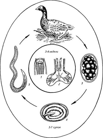 Рис 94 Биология развития A anseris: 1 - головной конец нематоды, 2 - хвостовой конец самца, 3 - неинвазионное яйцо, 4 - инвазион-ное яйцо, 5 — инвазионная личинка Профилактика и меры борьбы. На неблагополучных птицефермах молодняк гусей необходимо содержать изолированно на свободных от инвазии выгулах. Не рекомендуется выпасать птиц на низинных увлажненных пастбищах. Откормочное поголовье содержат строго изолированно от птиц других направлений. Выгульные площадки желательно иметь с твердым покрытием. При выращивании птиц на глубокой несменяемой подстилке помещения убирают после смены каждой партии птиц. Для своевременного выявления амидо-стомоза на птицефермах необходимо вскрывать всех павших гусей и периодически исследовать помет птиц по Фюллеборну. Профилактические дегельминтизации осуществляют через месяц после перевода гусей на зимнее содержание и весной за месяц до выгона на пастбище или водоемы. Вынужденное лечение проводят в любое время года. Date: 2015-07-02; view: 944; Нарушение авторских прав |