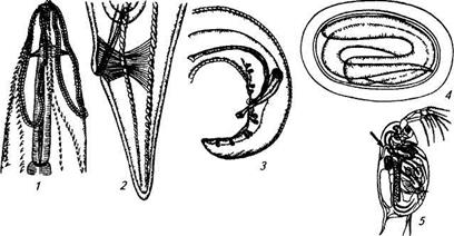 Рис 98 Echinuna uncmata 1— головной конец, 2 — хвостовой конец самки, 3 — хвостовой конец самца, 4 — яйцо (по Н П Романовой), 5 — дафния с личинкой эхинурии