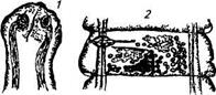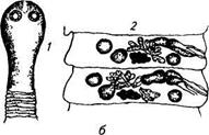 Рис 111 Цестоды грызунов а — Matevotaema simmetnca, б — Humenolepis dipmuta, 1 — сколекс цестоды, 2 — гермафродитный членик ставит под сомнение правильность проводимых экспериментов и искажает сущность опытов. Поэтому изучение инфекционных и инвазионных болезней лабораторных грызунов, существенно влияющих на их гомеостаз, является важной проблемой для теории и практики медико-биологических экспериментов (рис. 111). Лабораторных грызунов относят к отряду Rodentia, в котором имеется 3 семейства: 1. Мышеобразные Muridae, род Rattus — крысы; 2. Muridae, подсемейство Murinae, род Mus — мыши; 3. Свинковые Caviidae, род Cavia (Porcellus) — морские свинки. На территории России у домовой мыши (Mus musculus) зарегистрировано 62 вида гельминтов. Из этого числа 51 вид паразитирует в половозрелой стадии и 11 видов — в личиночной. Гельминты домовой мыши принадлежат к следующим классам: цестодам — 24 вида, трематодам — 9 видов (2 семейства) и нематодам —- 29 видов (6 подотрядов). Многие из гельминтов являются биогельминтами. В частности, для цестод промежуточными хозяевами служат низшие клещи и насекомые. Что касается биологии развития многих цестод (в стадии имаго локализуются в тонком кишечнике), то грызуны сами выполняют роль промежуточных хозяев. При этом личиночная стадия цестод локализуется в подкожной клетчатке, в мышечной ткани, в грудной и брюшной полостях, на серозных покровах паренхиматозных органов, в печени и легких. К настоящему времени у серой крысы (пасюк) зарегистрировано 49 видов гельминтов из 3 классов. Из них 42 вида паразитируют у крысы в половозрелой стадии, 6 — в личиночной, 1 вид — в половозрелой и личиночной стадиях (трихинелла). По классам они распределены в следующем порядке: трематод — 16 видов, цестод — 13 видов и нематод — 20 видов (из них 4 биогельминта и 16 геогельминтов). Биология развития цестод происходит с участием низших клещей и насекомых.