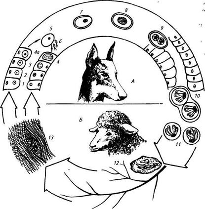 Рис 123 Биология развития Sarcocjstis ovicanis А — развитие в кишечнике собак, Б — ра1витие в организме овец, 1 — 4 — развитие микрогаметы, 4а — развитие макрогаметы, 5 — макрогамета, 6 — микрогаметы, 7—Q — спорогония, 10 — спору- лированная ооциста, 11 — слороцисты, освободившиеся из ооцисты, 12 — меронты в кровеносных сосудах, 13 — циста в мышцах промежуточного хозяина.