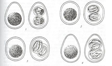 Спорозоиты цилиндрической формы, обычно занимают всю длину спороцисты. Продолжительность споруляции 16—48 ч, препатентного периода 9—11 сут, патентного — 28 сут. Cystoisospora ohioensis паразитирует у собак. Ооцисты имеют овальную или яйцевидную форму, размеры (20...27)х(15...24) мкм бледно-желтый цвет, могут быть бесцветными. Спороцисты эллипсоидной формы, размерами (12... 19)х(9... 13) мкм, содержат остаточное тело. Спорозоиты банановидной формы, размерами (9...13)х(2,5...5) мкм, содержат одну или более светлых гранул. Препатентный период длится 4,5 сут, патентный — до 35 сут. Cystoisospora felis паразитирует у кошек. Ооцисты имеют яйцевидную форму, размеры (32...53)х(26...43) мкм, светло-желтый или светло-коричневый цвет. Светопреломляющая гранула содержится не во всех ооцистах. Спороцисты эллипсоидные, размерами (20... 17)х(17...22) мкм, включают остаточное тело. Спорозоиты цилиндрической формы, длиной 10—15 мкм. Продолжительность споруляции 12—48 ч, препатентного периода 7—10 сут, патентного — 10—12 сут. Cystoisospora rivolta паразитирует у кошек. Ооцисты имеют овальную или яйцевидную форму, светло-коричневый цвет, могут быть бесцветными, размеры (23...29)х(20...26) мкм. Спороцисты широкоэллипсоидные, размерами (14...16)х(10...13) мкм, содержат остаточные тела. Спорозоиты банановидной формы располагаются вдоль всей ооцисты. Продолжительность споруляции 1—2 сут, препатентного периода 4—7 сут, патентного — 66 сут. Биология развития. Собаки и кошки заражаются при проглатывании спорулированных ооцист цистоизоспор и при поедании инвазированных мышевидных грызунов. Последние могут быть факультативными промежуточными или резервуарными хозяевами цистоизоспор. При инвазировании ооцистами собак и кошек в кишечнике вначале происходит процесс бесполого размножения паразита — мерогония. В эпителиальных клетках формируются последовательно три генерации меронтов, затем макро- и микрогаметы, которые копулируют с образованием зиготы. Из зиготы формируется ооциста и выводится во внешнюю среду, где спорулирует. Инвазионными ооцистами цистоизоспор могут заражаться мыши, крысы, хомяки. В течение недели после заражения паразит размножается в организме животного — в мезентериальных лимфатических узлах, особенно в лимфоидных фолликулах, а также в легких, печени, селезенке, скелетной мускулатуре тела, где сохраняется длительное время (до 23 мес). Стадии, развивающиеся у факультативных промежуточных хозяев, называют гипнозоитами или монозоитными цистами. Дальнейшее развитие гипнозоита возможно лишь в организме дефинитивного хозяина. При этом следует отметить, что при заражении собак и кошек через поедание инвазированных мышей, крыс, хомяков или их паренхиматозных органов препатентный период сокращается на 1—3 сут по сравнению с заражением их спорулированными ооцистами. Цистоизоспоры С. felis и С. rivolta обладают биологической особенностью, заключающейся в том, что в организме кошек можно обнаружить внекишечные стадии их эндогенного развития в различных внутренних органах, а также мезентериальных лимфатических узлах. Эпизоотологические данные. Цистоизоспорозы собак и кошек распространены повсеместно. Экстенсивность инвазии может достигать 20 % и выше. Источники заражения — больные и переболевшие животные, выделяющие с фекалиями ооцисты цистоизоспор. Заражение происходит через загрязненные корма, вымя матери, воду, по