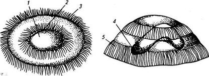 Инвазионная болезнь рыб, которая вызывается паразитическими формами инфузорий семейства Urceolariidae. При благоприятных условиях инфузории быстро размножаются и поселяются на коже и жабрах рыб, что нередко является причиной их гибели. Эти паразиты распространены почти повсеместно, особенно в центральных и южных районах, и наносят заметный ущерб рыбоводческим хозяйствам. Возбудитель. В настоящее время найдено 6 возбудителей заболевания: Trichodina mutabilis, Т. acuta, Т. pediculus, Т. epizootica, T. meridionalis, T. domerquei, которые относятся к семейству Urceolariidae. Тело инфузорий блюдцеобразной или грушевидной формы, величиной 25:—76 мкм. Паразит имеет своеобразный венчик, который состоит из хитиновых крючков с внутренним и наружными отростками и подкововидным ядром (макро- и микронуклеусами). На верхнем и нижнем концах диска тела инфузории расположены 2 круга ресничек, с помощью которых триходины свободно плавают в воде и быстро передвигаются по поверхности тела и жабрам рыбы (рис. 141). Триходины размножаются на теле рыбы путем простого поперечного деления на две части — одинаковые дочерние особи. При этом вначале у паразита образуется перетяжка, потом он делится на две одинаковые части, в которых остается по половинному набору крючков. Быстро в молодом паразите образуется новый опорный венчик, который состоит из определенного числа крючков, а старые крючки исчезают. Вне тела хозяина триходины живут только 1—2 сут. Биология развития. Триходины размножаются путем чередования простого деления и конъюгации.