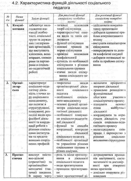 Професія "соціальний педагог" в Україні була введена до кваліфікаційного переліку спеціальностей у 2002 р. Соціальний педагог - спеціаліст, зайнятий у сфері соціально-педагогічної роботи або освітньо-виховної діяльності. Він організовує взаємодію освітніх та позанавчальних установ, сім'ї, громадскості з метою створення в соціальному середовищі умов для соціальної адаптації та благополуччя в мікросоціумі дітей та молоді, їх всебічного розвитку. Соціальний педагог у відповідності з посадовими обов'язками: вивчає психолого-медико-педагогічні особливості дітей та молоді; умови їх життя в мікросоціумі; виявляє інтереси, потреби, труднощі, проблеми, конфліктні ситуації відхилення в поведінці дітей та молоді; надає їм своєчасну допомогу та підтримку; виступає посередником між особистістю та організацією, сім'єю, спеціалістами різних соціальних служб, відомств та адміністративних органів; здійснює реабілітацію дітей-інвалідів; організує роботу з дітьми та молоддю за місцем проживання; забезпечує соціальний супровід дітей-сиріт; працює по профілактиці негативних явищ серед дітей та молоді. Придатність спеціаліста до виконання перерахованих посадових обов'язків визначається рівнем сформованості в нього когнітивного (знання) та операційного (вміння) компонентів готовності до соціально-педагогічної діяльності. До системи базових теоретичних знань соціального педагога відносять знання: основ соціальної політики держави та соціально-правового захисту дітей та молоді; основ соціологи, психології та педагогіки; основних закономірностей розвитку особистості; специфіки потреб та інтересів різних вікових груп дітей та молоді; специфіки роботи в різних мікросоціумах; особливостей діяльності з сім'єю, різними групами дітей та молоді; функцій державних і недержавних організацій в системі соціально-педагогічної діяльності; способів психолого-педагогічної діагностики; сучасного стану і тенденцій розвитку дитячих та молодіжних об'єднань. Ці знання реалізуються в практичній діяльності соціального педагога. Вони тісно пов'язані з професійними вміннями. Комунікативні уміння передбачають володіння культурою міжособового спілкування, налагодження контакту з іншою людиною, розвиток взаємодії з клієнтом в позитивному емоційному напрямку. Аналітичні вміння спрямовані на аналіз процесів, що відбуваються в соціумі, аналіз стану дитини та впливу на неї мікросоціуму; виділення проблем дитини та розуміння сумісної діяльності з нею по їх подоланню. Організаторські вміння - створення і розвиток офіційної та неофіційної мережі соціальної підтримки особистості, залучення волонтерів, що можуть надати ресурси, послуги та інші види допомоги. Прогностичні вміння передбачають прогнозування розвитку особистості з врахуванням її проблем; постановку мети діяльності та її завдань, передбачення можливого результату роботи; планування етапів майбутньої діяльності. Проектувальні вміння дозволяють створювати програми діяльності по окремим напрямах роботи; здійснювати відбір необхідних методів та форм діяльності; конкретизувати зміст роботи в кожному окремому випадку. Соціально-педагогічна робота належить до таких видів професійної діяльності, в яких не лише знання та вміння, а особистісні якості спеціаліста впливають в багатьох випа