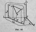 Билет №15 с 36. Плоскости, перпендикулярные плоскостям проекций (проецирующие плоскости) 1. Горизонтально проецирующая плоскость α перпендикулярная π1. Плоскость а, перпендикулярная горизонтальной плоскости проекций π1, называется горизонтально проецирующей (рис. 53, 54). Основным свойством горизонтально проецирующей плоскости является то, что любая фигура, расположенная в этой плоскости, проецируется на π1 в прямую линию (горизонтальный след плоскости h0α, Рис- 53, 54).