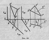 Билет №11 с 29 Следом прямой линии называется точка пересечения прямой с плоскостью проекций. В системе двух плоскостей проекций Л! и л2 прямая в общем случае имеет два следа: горизонтальный Н (Н', Н") и фронтальный F (F', F") — точки пересечения прямой соответственно с горизонтальной и фронтальной плоскостями проекций. Горизонтальный след прямой — это такая точка этой прямой, координата z которой равна нулю (z = 0). Фронтальный след прямой — это точка прямой, координата у которой равна нулю (у = 0). Пользуясь этим правилом, нетрудно определить следы прямой на эпюре. В начертательной геометрии считается, что наблюдатель расположен в первом пространственном углу на бесконечном расстоянии от плоскостей проекций, поэтому видимыми геометрическими фигурами будут только те, которые расположены в первом углу. Проекции этих фигур в ортогональных и аксонометрических проекциях показываются сплошными линиями. Фигуры, расположенные в других пространственных углах, не видны наблюдателю, и их проекции показываются штриховыми линиями.