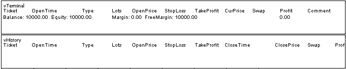Ниже на графике - окна "Терминала" и "История сделок". Пока мы не начнем торговлю, они будут пустыми: