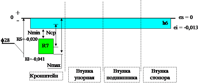 Рисунок 6.1 Схема расположения полей допусков по размеру ф28 Расчетные характеристики посадки: Nmax = es - EI = 0 - (-0,041) = 0,041 мм. Nmin = ei - ES = -0,013 - (-0,020) = 0,007 мм. Ncp = (Nmax + Nmin)/2 = (0,041 + 0,007)/2 = 0,024 мм. Результаты анализа посадки ф28 R7/h6 заносим в таблицу 6.1 Посадка ф40 H7/c8 Буквенное обозначение «H» показывает, что отверстие является основным, следовательно, посадка выполнена в системе отверстия. По данным таблицы 3 ГОСТ 25347-89 посадка относится к числу рекомендуемых. Величину допуска отверстия находим по таблице 1 ГОСТ 25346-89. Для размера 40 по 7 квалитету точности TD = 0,025 мм. Предельные отклонения размера отверстия: основное отклонение нижнее EI = 0, верхнее ES = 0,025 мм,. Величины предельных отклонений размера вала находим по таблице 7 ГОСТ 25347-82. Для 8 квалитета точности и буквенного обозначения «c» отклонения равны: основное отклонение верхнее es = -0,120 мм, ei = -0,159 мм. Допуск вала: Td = es - ei = -0,120 - (-0,159) = 0,039 мм. Допуск посадки: TN(S) = TD + Td = 0,025 + 0,039 = 0,064 мм.