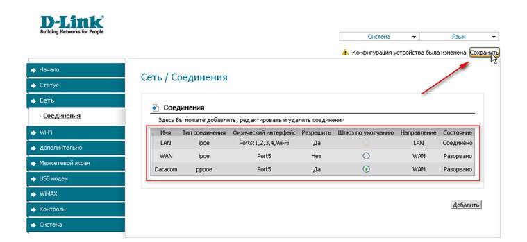 Далее необходимо выбрать подключение которое мы будем использовать по умолчанию. В таблице с настроенными соединениями необходимо установить Шлюз по умолчанию на соединении Datacom.