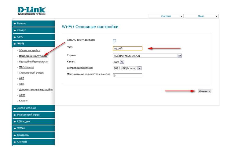 В левом меню выбираем Основные настройки. В поле SSID вводите УНИКАЛЬНОЕ имя Вашей беспроводной сети, его необходимо придумать самостоятельно. Остальные параметры оставляем по умолчанию. Нажимаем Изменить.