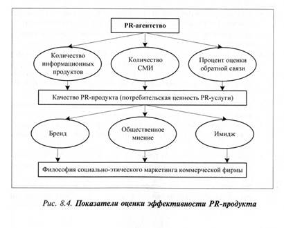 PR как составной элемент маркетинговых коммуникаций по успешному продвижению продукта к конечному потребителю — центральный компонент результативности маркетинга. Инструменты PR способствуют не только продвижению PR-услуги, но и формируют ее бренд, популярность в обществе и в целом имидж компании-заказчика. Технология оценки эффективности PR-продукта, его потребительской ценности в глазах заказчика не всегда отражается количественными показателями роста объемов продажи, снижением стоимости трансакций рыночного участия коммерческой структуры. При оценке PR как основного вида информационной деятельности, необходимо предусмотреть совокупные затраты на производство информационного продукта и его использование в практике маркетинговой деятельности. Показатели, влияющие на эффективность PR-проекта. На итоговую оценку эффективности результатов PR-проекта влияет система учета следующих показателей. 1. Количество информационных продуктов с включением базовых и оперативных. • к базовым следует отнести концепцию рыночного участия компании с выделением портфельных, функциональных и операционных стратегий маркетинга; тактику формирования дистрибуции и системы sales promotion с использованием специальных PR-акций; обоснование бюджета исследования и сценария исполнения PR-проекта; заключительный отчет по использованию рекомендаций; • в качестве оперативных информационных продуктов выступают PR-послания; анонсы, приглашения на специальные акции; ньюс релизы; бэкграундэры; оперативная информация в СМИ для мотивации активных коммуникаций. 2. Количество организаций СМИ, с которыми установлены контакты. Практика отмечает, что организация процесса рассылки оперативных информационных продуктов должна предусмотреть не только адреса, рекомендованные заказчиком, но и дополнительные адреса со стороны PR-специалиста или PR-агентства как исполнителя заказа. Наряду с этим очень важно фиксировать реакцию представителей СМИ на полученное послание. 3. Процент оценки результатов обратной связи с представителями СМИ. На практике данная оценка включает три показателя: · количество СМИ, с которыми установлена обратная связь в результате позитивной реакции на приглашение корпорации; · количество представителей СМИ, посетивших специальные мероприятия; · количество лиц, осветивших свои впечатления от юбилея компании, пресс-конференции, презентации, благотворительных акций. Оценка эффективности PR-проекта представлена на рис. 8.4