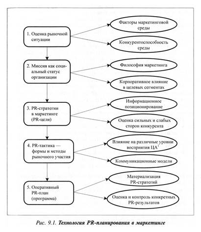 Ответ: а) — 2, б) — 3, в) — 1 Глава IX Технология PR-планирования Механизм PR-планирования. Практика становления рыночных отношений в стране отмечает, что процесс PR-планирования обеспечивает успешное позиционирование коммерческой структуры с учетом факторов внутренней и внешней деловой среды на базе гибкого использования информационного пространства. PR-планы ориентированы на достижение генеральной цели организации по ключевым направлениям товарной, ценовой, коммуникативной политики. Базу PR-планирования в маркетинге составляет миссия компании, коммерческая информация философии рыночного участия с выделением оценочных показателей качества товара, его потребительской ценности, конкурентоспособности, уровня ресурсного потенциала, состояния системы товародвижения и роли компании на внутреннем и внешнем рынках сбыта. Совершенно очевидно, что цели, стратегии, тактика и реализация PR-планов являются производными маркетинговой деятельности. В системе PR процесс планирования — непрерывный процесс разработки форм, методов, оценочных показателей для достижения корпоративной миссии. Как правило, разработка PR-кампаний, PR-программ, IR-программ (Investor Relations — инвестиционная программа) всегда начинается с комплексной оценки факторов внутренней и внешней маркетинговой среды функционирования коммерческой структуры. Технология PR-планирования в маркетинге предполагает изначально исследование системы ценностей, духовных убеждений, уровня общественного мнения и реальных возможностей PR-службы создать эффективные коммуникации с властными структурами, выгодными инвесторами и партнерами в целях успешного решения PR-проекта. Механизм PR-планирования в маркетинге последовательно включает: · комплексную оценку ситуации на рынке; · ресурсные возможности компании с выделением сильных и слабых сторон лидирующего конкурента; · популярность бренда; · PR-стратегии рыночного участия; · тактику и программы оперативной реализации маркетинга. Основные функции PR-планирования — моделирование будущих изменений рыночного участия компании, ее деловой среды, координация совокупных действий всех элементов предпринимательства для достижения желаемого коммерческого успеха. В целом технология PR-планирования представляет органический синтез перспективного и оперативного PR-планирования по развитию коммерческой компании, направленного на достижение поставленных целей маркетинга с помощью PR-службы и PR-специалистов. Для организаций предпринимательского сектора, действующих в конкретной среде, можно выделить такие основные виды PR-планов, как долгосрочный и оперативный. Долгосрочный PR-план — это системный документ, охватывающий период от двух до пяти лет, в котором формируются главные цели фирмы на перспективу, конкретные задачи, указанные по времени и ресурсам, общая PR-стратегия для достижения поставленных целей с учетом влияния факторов рыночной среды. Долгосрочное планирование определяет текущие направления деятельности. Оперативное PR-планирование в коммерческой компании охватывает годовой или более короткий период и представляет собой основной вид планомерного воздействия на общественное мнение и общественные отношения. Годовой PR-план настраивает целевые аудитории на позитивное, благотворное восприятие деятельности фирмы, ее целе