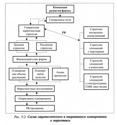 Стратегическое и оперативное PR-планирование в маркетинге. В целом формирование PR-плана тесно связано с разработкой бюджета PR-работ, который в свою очередь функционально зависит от структуры и размеров статей доходов и затрат маркетинга. Этот симбиоз PR-планирования в маркетинге проиллюстрирован в схеме рис. 9.2. Начальная точка для формирования бюджета деятельности PR-службы — определение генеральной стратегии маркетинга. Составление финансового плана может оказать содействие в правильной расстановке приоритетов между стратегиями маркетинговой деятельности. Генеральная стратегия маркетинговой деятельности компании направлена на конкретизацию для каждого рынка цели развития фирмы. Эта стратегия осуществляется в тесной увязке с разработками конкретных PR-стратегий, а именно: · осуществление внутренних коммуникаций, т.е. создание самой дееспособной структуры управления, предупреждающей конфликтные ситуации и легко адаптируемой к рыночным изменениям; · стратегия отношений с партнерами, позволяющая установить гармонию взаимопонимания и доверия в рамках концепции партнерства, учитывающей интересы всех участников рыночного оборота; · стратегия отношений с клиентами, предусматривающая и учитывающая вкусы, требования, замечания и их претензии, а также достойное качество обслуживания; · стратегии построения отношений со средствами массовой информации и представителями органов исполнительной, законодательной власти, позволяющей осуществлять лоббирование собственных интересов, формировать достойный имидж в обществе. Исходя из этого можно сделать вывод, что PR-планирование должно представлять собой симбиоз из коммерческого, инвестиционного и представительского планирования. Стратегический план используется для проверки смелых коммерческих идей как инструмент прогнозирования результатов предпринимательской деятельности. В целом структура стратегического планирования должна позволить создать такую систему мер, которая своевременно реагирует на возмущения внешней среды и предоставляет органам управления возможность принимать действенные меры для решения возникающих проблем. ·