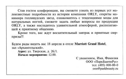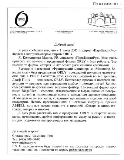 Фирма «ПаркБьютиРус» с 1 июля 2005 г. - официальный дистрибьютор фирмы ORLY в России. ORLY -ведущая мировая фирма, которая в течение тридцати лет специализируется на создании средств по уходу за натуральными ногтями Миссия компании: «Мы работаем, чтобы дарить людям красоту и уверенность» Определяя каналы продаж, во внимание была принята необходимость сочетания трех основных качеств: • имидж места представления; • позиционирование собственно бренда; • доступность марки конечному потребителю. Приоритетный канал представления ORLY — салоны красоты. Второй канал продаж — магазины класса «А» и выше: Не de Beaute, «Арбор Мунди», сети магазинов «Сток-манн» Получить признание профессиональных мастеров и поставлять свою продукцию в каждый салон России 1. Вернуть бренду утраченные позиции как профес- сиональной продукции. 2. Доказать мастерам индустрии красоты, что ORLY по-прежнему занимает достойное место среди других профессиональных средств ухода за ногтями и руками Цели PR 1. Позиционировать марку на рынке профессиональ- ной косметики. 2. При помощи СМИ формировать у потребителя куль- туру ухода за руками и ногтями. 3. Установить прочные взаимоотношения с целевыми аудиториями. Фирменный стиль. В момент создания компании был определен фирменный стиль, в соответствии с которым сделан ремонт в снятом помещении. Интерьер был создан руками профессиональных дизайнеров. Пристальное внимание было уделено оформлению самого помещения. Переговорная и комнаты сотрудников были украшены плакатами с фирменной символикой Стратегия PR 1. Позиционировать марку на рынке профессиональ- ной косметики в более широком диапазоне, чем кон- курирующие компании. 2. Наладить доброжелательные взаимоотношения с пред- ставителями масс-медиа. 3. Спланировать участие специалистов компании в со- здании журналов для профессионалов ногтевого бизнеса, увеличить их комментарии, профессиональ- ных СМИ. 4. Наладить выпуск корпоративного издания, предна- значенного для мастеров салонов красоты всей Рос- сии для рассылки его по созданной региональной и московской базе организаций бьюти-индустрии Для реализации оперативного плана с руководством была разработана конкретная PR-программа с июня 2005 до мая 2006 г. Взаимодействие со СМИ незаменимо в работе любой компании, так как именно таким образом осуществляется контакт с целевыми группами внешней общественности: клиентами (существующими и потенциальными), партнерами, акционерами, государственными структурами. При взаимодействии со средствами массовой информации в целях формирования имиджа и репутации были использованы такие технологии, как: · рассылка новостных пресс-релизов; · участие в бьюти-рубриках глянцевых изданий; · комментарии специалистов материалов о культуре ухода и прави-вилах ухода за руками и ногами; · интервью с руководством компании; · пресс-конференции. В результате усилий PR-отдела и руководства была разработана стратегия позиционирования компании, которая проиллюстрирована в приложении 2. Для того чтобы сообщить СМИ информацию о том, что официаль ный эксклюзивный представитель марки ORLY изменился, PR-менеджерог, был разослан пресс-релиз по базе российских и профессиональны: и глянцевых изданий. С пресс-релизом, разосланным журналистам, редак торам изданий и редакторам бьюти-рубрик, можно ознакомиться в пр