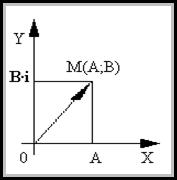 Не менее важной и удобной является интерпретация комплексного числа A+B· i как вектора, т.е. вектора с началом в точке O(0;0) и с концом в точке М(A;B). Соответствие установленное между множеством комплексных чисел, с одной стороны, и множествами точек или векторов плоскости, с другой, позволяет комплексные числа точками или векторами.
