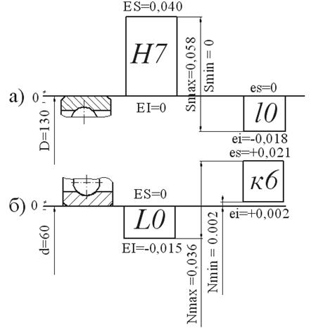 Рисунок 5.1 Схема расположения полей допусков сопряжений: а) «наружное кольцо – корпус» б) «внутреннее кольцо – вал». Тогда запишем условное обозначение соединения «внутреннее кольцо–вал»: Ø 60L0/к6. где L0 –поле допуска внутреннего кольца подшипника нулевого класса точности. Посадку под кольцо, имеющее местный вид нагружения, выбирают из таблицы 18 /1/. Для D =130 мм– Н7, система отверстия. Условное обозначение соединения «корпус – наружное кольцо подшипника»: Ø 130Н7/l0, где l0 – поле допуска наружного кольца подшипника нулевого класса точности. 5. Исходя из выбранных посадок выполняем схемы полей допусков.