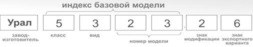 Система обозначений подвижного состава. Первые четыре цифры являются индексом базовой модели. Первая цифра - обозначение класса автомобильной техники. Грузовые автомобили имеют 7 классов в зависимости от грузоподъемности, легковые автомобили подразделяются на 4 класса в зависимости от объема двигателя, а автобусы на 5 классов, которые зависят от габаритной длины автобуса. Вторая цифра обозначения определяет вид (1 - легковые автомобили, 2 – автобусы, 3 – грузовые автомобили, 4 – тягачи, 5 – самосвалы, 6 – цистерны, 7 – фургоны, 8 – резерв, 9 – специальные автомобили). Третья и четвертая цифры обозначают номер модели, и они присваиваются заводом-изготовителем. Пятая цифра присваивается модификации базовой модели заводом-изготовителем. Шестая цифра указывает на вариант экспортного исполнения, предназначенного для определенных условий эксплуатации.