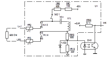 4.3.2.1 Упрощённая электрическая принципиальная схема ДСТ ТЭЗа БАК представлена на рисунке 13. Функцию ДСТ ТЭЗа БАК выполняет микросхема DA5. Сигнал ДСТ “1IN”, формируемый микросхемой DA5, имеет два статических логических уровня: высокий и низкий. Переключение сигнала “1IN” из состояния с высоким логическим уровнем в состояние с низким логическим уровнем происходит, как при замыкании АЛ через схему ОАТУ нагрузкой 600 Ом (равнозначно снятию абонентом телефонной трубки), так и во время передачи абоненту вызывного сигнала “~95V”. При замыкании АЛ через схему ОАТУ нагрузкой 600 Ом через диод микросхемы DA5 начинает протекать ток источника питания “минус 60V”. Транзистор микросхемы DA5 открывается и происходит переключение сигнала “1IN” из высокого логического уровня в низкий. Суммарное сопротивление нагрузки ОАТУ и АЛ должно быть не более 1800 Ом.