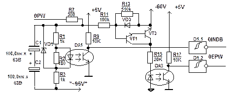 4.3.2.2 ДКВН ТЭЗа БАК предназначен для обеспечения минимального значения тока через контакты 1К2.2:5, 1К2.2:6, 1К2.2:7, 1К2.2:8 реле 1К2 во время их переключения. Упрощенная электрическая принципиальная схема ДКВН представлена на рисунке 14. Перед замыканием контактов 1К2.2:5, 1К2.2:6 реле 1К2 к ним подключена цепь “минус 60V”. Момент переключения контактов 1К2.2:5, 1К2.2:6, 1К2.2:7, 1К2.2:8 реле 1К2 синхронизируется с моментом равенства синусоидального сигнала вызова абонента “~95V” напряжению минус 60 В.Этот момент времени отслеживается с помощью сигнала “0EPW”, который представляет собой серию импульсов, сформированных из сигнала вызова абонента “~95V”. ДКВН состоит из резисторов: R11, R13, R15, R17; диода VD3; транзисторов: VT1, VT3; микросхем: DA3, D1.2; конденсатора С5. Схема ДКВН работает по принципу сравнения мгновенного значения переменного синусоидального напряжения сигнала вызова абонента “~95V” с постоянным напряжением цепи “минус 60V”. Пока мгновенное значение переменного напряжения меньше минус 60 В транзисторы VT1, VT3 закрыты. Как только мгновенное значение переменного напряжения становится больше минус 60 В, открываются транзисторы VT1, VT3, открывается ключевой транзистор микросхемы DA3 и формируется сигнал “0EPW” на выходе микросхемы D1.2 с высоким логическим уровнем.