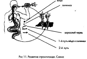 Во внешней среде личинки развиваются во взрослых самцов и самок. Самки после оплодотворения откладывают в почве яйца, из которых выходят рабдитовидные личинки. После линьки они превращаются в филярие-видные личинки. Если личинки, вышедшие из яйца, задерживаются в кишечнике (запоры) свыше 24 часов, они превращаются в филяриевидных личинок без выхода во внешнюю среду. Эти личинки проникают в капилляры кишечной стенки и после миграции превращаются во взрослых червей. Личинки проникают в человека через рот, через кожу. И прежде чем они станут половозрелыми паразитами, они мигрируют по большому и малому кругу кровообращения (рис. 11).