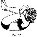 Вход в асану: На счет 3-4 выдох. Обхватите колени руками (ладони на локтях), голову нагните к коленям, Эффект: Растяжка позвоночника, выброс из кишечника газов, активизация перистальтики, улучшение кровообращения и дыхания. Эта поза может помочь «науглекислородить» кровь, продлить время пребывания в парной. Она не зря называется позой плода, т. к. в ней тело занимает положение очень экономно в пространстве и способствует самым эффективным режимам процессов жизнеобеспечения. 5. «Катушка» Исходное положение: Как в позе «Плода» (рис. 55). Вход в асану: Притяните голову к коленям. Динамичное исполнение: На счет 3-4 сильно качнитесь назад, голова по-прежнему прижата к коленям. Качание назад — вперед проводите на свободном дыхании (рис. 57). Эффект: «Катушка» усиливает эффект предыдущей асаны. Она «утюжит» позвоночник, увеличивает его подвижность, тонизирует мышцы спины, увеличивает подвижность грудной клетки. После «Катушки», как динамичного упражнения, успокойте дыхание, примите позу «Мертвого человека».
