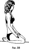 6. Сед на пятках. Поза «Ученика» Вход е асану: Медленно опуститесь на колени и спокойно сядьте на пятки. Ступни, колени, бедра сомкнуты по всей длине, от колен до кончиков пальцев полностью соприкасаются с полом. Ладони спокойно лежат на коленях. Туловище держите прямо. Мышцы по возможности расслабьте. Дыхание ровное, ритмичное, спокойное. Глаза закрыты (рис. 58). Если начинающему трудно сразу сесть на пятки, то можно слегка наклониться вперед и поддерживать туловище руками. Носки вместе — пятки врозь. Ноги можно слегка разомкнуть.