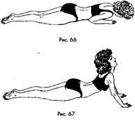 12. Поза «Змеи» Исходное положение: Ложитесь на живот, выпрямите и соедините ноги: бедро, голень, голеностоп — одна линия. Вход в асану: На счет 3-4, выдыхая, медленно прогнитесь назад на вытянутых руках (рис. 67).