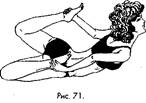 Асана: Задержите дыхание на счет 3-4. Внимание сосредоточьте на пупке. Эффект: Хорошо развивает мышцы живота, спины, активизирует работу почек, оздоравливает нервы позвоночника, увеличивает диафрагму. Повторите 4 раза. 14. Поза «Обруч» Исходное положение: Ложитесь на живот, лицом вниз, лбом касаясь пола. Согнутые в коленях ноги широко разведите, возьмитесь ладонями за голеностоп. Вдох (рис. 70).