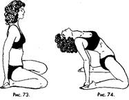 Асана: Задержите дыхание на счет 3-4. Внимание на позвоночнике, пищеварительных органах. Эффект: Асана улучшает кровообращение органов брюшной полости. Повторите 4 раза. Если вы хотите укрепить брюшную стенку, никогда не знать грыжи, значительно помолодеть, окрепнуть как мужчина, расстаться с лишним весом и животом в частности — научитесь ходить в «Обруче». 20 метров ходу в «Обруче» — это средняя норма здорового человека. Счастливого пути! Отдохните и расслабьтесь. 15. Поза крокодила (описание см. выше) 16. Сед между пяток Из позы «Крокодила» согните колени, широко раздвинув ноги, встаньте на колени. Голень и голеностоп — прямая линия, прижаты к полу. Медленно сядьте между пяток. Руки на коленях, пальцы выпрямлены. Закройте глаза. Дышите ритмично, спокойно. Внимание на мочеполовой системе и анусе (рис. 72). Эффект: Хорошо растягивает связки коленных и голеностопных суставов, увеличивает подвижность коленных, голеностопных и тазобедренных суставов. Формируется правильный изгиб стоп. 17. Зажим «Анус» Исходное положение: Сед между пяток (рис. 72). Вдох. Вход в асану: На счет 3-4, выдыхая, закройте глаза, сожмите промежность. Асана: Задержите дыхание на счет 3-4. Внимание на анусе. Выход из асаны: На счет 3-4, медленно вдыхая, расслабьте мышцы промежности. Эффект: Асана укрепляет мышцы прямой кишки, геморроидальную зону, мышцы промежности, влагалища, мочеиспускательный и заднепроходный клапаны. 18. Поза «Верблюда» Исходное положение: Сед между пяток, ладони на пятках. Вдох (рис. 73).