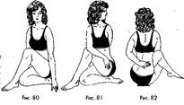 Асана: Задержите дыхание на счет 3-4. Внимание на эндокринную систему и солнечное сплетение. Выход из асаны: На счет 3-4 медленно вдыхая, поднимитесь, выпрямитесь и поменяйте положение ног. Повторите 4 раза, Эффект: Тот же, что и в «Полулотосе». Кроме того, усиливает кровообращение мышц спины, рук, ног, 24. Перекрут «Коровья морда» Исходное положение: «Полулотос». Правая ступня прижата к левому паху. Вдох (см. рис. 78). Вход в асану: На счет 3-4, медленно выдыхая, левую ногу поставьте за правое бедро. Правую руку согните в локте и обнимите ею левое колено. Правую ладонь положите на левое бедро, обнимая себя за талию сзади. Голову и корпус поверните до упора влево (рис. 80, 81, 82).
