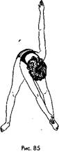 28. «Треугольник» стоя Исходное положение: Ноги на ширине плеч. Руки в стороны на ширине плеч, ладони вниз. Вдох. Вход в асану: На счет 3-4 медленно поворачивайте туловище в правую сторону и наклоняйтесь к правой ноге, Асана: Задержите дыхание на счет 3-4. Внимание на мышцах тела. Выход из асаны: Медленно вдыхая, на счет 3-4 вернитесь в исходное положение (рис. 85).