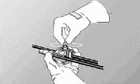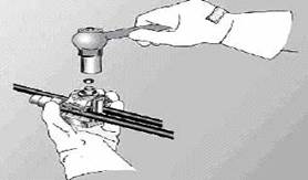 Рис 1.10. Установка прокалывающего зажима: а - до монтажа; б - во время монтажа; в - после срыва головки В процессе монтажа конектор легко устанавливается на провод, отсутствуют выпадающие компоненты. Правильное положение провода идущего на ответвление легко контролируется через резиновый колпачок, который прикреплен к корпусу зажима. Контактные пластины прокалывают изоляцию и обеспечивают надежный контакт с жилой. Болт изолирован от контактных пластин, что обеспечивает максимальную безопасность электромонтера даже при монтаже под напряжением. Конекторы имеют шестигранную срывную головку, у которой момент затяжки значительно ниже, чем на изолированных прокалывающим зажимах, что предотвращает повреждение жил провода от больших усилий при затягивании. Герметизирующие накладки плотно прижимаются к изоляции, обеспечивая полную защиту от проникновения влаги. На рис. 1.11 изображен процесс монтажа герметичного прокалывающего конектора на самонесущий изолированный провод: