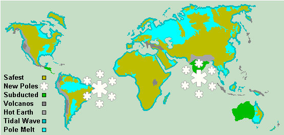 Существует много мест на Земле, которые более безопасны, чем другие. Здесь нужно руководствоваться здравым смыслом. Тот, кто читал литературу о геологических изменениях в прошлом, а также знаком с письменными и устными свидетельствами о том, что происходило во время прошлых катаклизмов, может представить себе их ход. Береговые линии являются опасными местами, так как приливные волны будут огромными. Угрозу будут представлять также плиты, пододвигающиеся под другие, либо области, вблизи которых происходят процессы горообразования. Не следует находиться в зданиях, которые могут быть разрушены в результате землетрясения; лучше всего выбирать самые простые убежища и конструкции, такие как палатки или соломенные хижины. Можно прятаться в естественных укрытиях, защищённых от ветров, таких как долины между горами. · Можно ожидать, что области, которые в недавнем прошлом были подвержены процессам горообразования, во время приближающегося сдвига полюсов будут подвержены им снова. Это включает в себя Скалистые горы к западу от Континентального водораздела, так как когда Тихий океан будет уменьшаться, то пододвигающаяся плита, исчезающая под западным побережьем, вызовет не только грандиозный подъём и сдвиг в тех областях земной поверхности, которые расположены над пододвигающейся плитой, но также и нагрев земли в результате трения. То же самое относится и к Гималаям. Но европейские горы не будут сколько–нибудь менее безопасны любых других мест в Европе, так как расширяющаяся Атлантика будет стремиться утянуть Европейский континент вниз за собой. Поэтому европейские горы могут быть безопаснее долин только в смысле подверженности приливным волнам. На горный хребет, протянувшийся по всей длине Южной Америки, во время сдвига полюсов будет оказано такое же воздействие, как и на Скалистые горы. И здесь область к западу от Континентального водораздела снова будет подвержена самым суровым испытаниям. · В обеих Америках восточная часть на Континентальном водоразделе имеет тенденцию двигаться через равнины на восток. Важную роль в этом процессе играет нагрев от трения, но нагрева от сжатия не будет. Нагрев от трения происходит также ближе к поверхности и исчезает быстрее, чем нагрев, вызванный трением нижней плиты, где он может дойти до того, что расплавит залегающие на поверхности горные породы. · Нет нужды говорить, что пещеры или искусственные туннели в горной области, подверженной катастрофическому воздействию сдвига полюсов, также не будут безопасными. Достаточно посетить Йосемитский парк, чтобы оценить силы, которые «вступят в игру». Долина глубиной примерно 700 м, окружённая высокими скалами, выглядит как свидетельство невероятной силы, которая в прошлом рассекла горный массив. Будут ли безопасными пещеры и искусственные туннели в старых горах? И да, и нет, так как в каждом случае необходимо проанализировать структуру горной местности и особенно прочность потолка пещеры или туннеля. Каждый случай индивидуален. Так как человек подвергается риску попасть в ловушку или быть раздавленным обвалившимися стенами и не иметь никакой надежды на помощь впоследствии, этот вариант можно считать более опасным, чем другие. · Вода смягчает удары и толчков землетрясения и, если вы находитесь под водой, от летящих осколков. Однако вода п