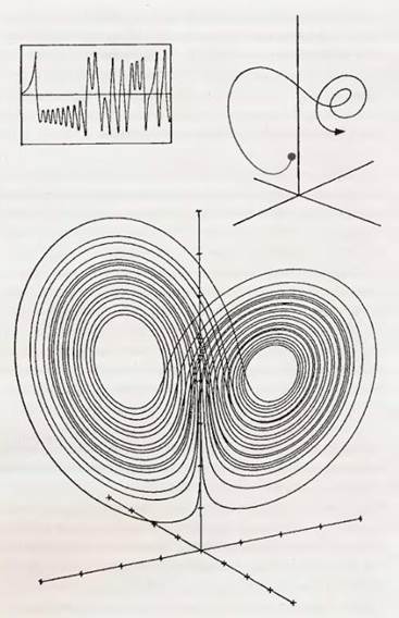 Физикам нравится думать, будто все, что надо сделать, сводится к фразе: вот начальные условия; что случится дальше? В 1960-м году Лоренц создал мини-модель погоды, которая привела в восторг его коллег. Он выбрал двенадцать уравнений, описывающих связь между температурой и атмосферным давлением, а также между давлением и скоростью ветра и применил на практике законы Ньютона Вот уже два столетия наука об атмосфере ждала появления машины, способной снова и снова производить тысячи вычислений, повинуясь указаниям человека. Лишь компьютер мог доказать, что мир идет по пути детерминизма, что погода подчиняется законам, столь же незыблемым, как и принципы движения планет, наступления солнечных и лунных затмений, морских приливов и отливов. Когда астроном говорил, что комета Галлея вновь приблизится к Земле через семьдесят шесть лет, это воспринималось как факт, а не как предсказание. Тщательно составленные численные прогнозы, основанные на детерминизме, определяли траектории космических кораблей и ракет. Отсюда следовал вывод: почему бы не рассчитать поведение ветра и облаков? Вполне понятно стремление исследователей XX-го века – биологов, физиологов, экономистов – разложить свои миры на атомы, подчиняющиеся законам науки. Во всех названных дисциплинах господствовал детерминизм сродни ньютоновскому. Впрочем, существовало одно маленькое «но», изменения никогда не бывают совершенными. Ученые, вставшие под ньютоновские знамена, обычно выдвигают следующий аргумент: имея приблизительные данные о начальном состоянии системы и понимая естественный закон, которому она подчиняется, можно рассчитать ее примерное поведение. Такой подход вытекает из самой философии науки. Один видный теоретик любил подчеркивать в своих лекциях: «Главная идея науки состоит в том, чтобы не обращать внимания на лист, падающий в одном из миров другой галактики, когда вы пытаетесь объяснить движение шарика по бильярдному столу на планете Земля. Однажды, зимой 1961-го года, намериваясь изучить определенную последовательность событий, Лоренц несколько сократил исследование – приступил к построению не с начальной точки, а с середины. В качестве исходных данных ученый ввел цифры из предыдущей распечатки. Когда он через час вернулся, отдохнув от шума и выпив чашку кофе, то увидел нечто неожиданное, давшее начало новой науке (рис. 1). Новый отрезок должен был полностью повторить предыдущий, ведь Лоренц собственноручно ввел в компьютер числа, и программа оставалась неизменной. Тем не менее, график существенно расходился с ранее полученным. Лоренц посмотрел сначала на один ряд чисел, потом на второй… С таким же успехом он мог наугад выбрать две случайные модели погоды. И первое, о чем он подумал, – вышла из строя вакуумная лампа. Внезапно ученый все понял. Машина работала нормально, а разгадка заключалась в числах, заложенных им в компьютер. Машина могла хранить в памяти шесть цифр после запятой, например …,506127. На распечатку же, в целях экономии места, выдавалось всего три: …,506. Лоренц ввел округленные значения, предположив, что разница в тысячных долях несущественна. Предположение выглядело вполне разумно. Следовало предполагать, что при незначительном отличии начальной точки от введенной ранее модель будет чуть-чуть расходиться с предыдущим вариантом. И все-так